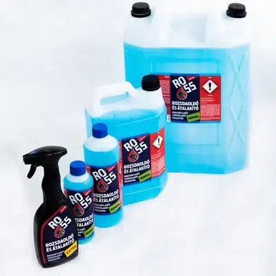 RO-55 rozsdaoldó és átalakító hatékonyan távolítja el a rozsdát. Fontos, hogy minden esetben először a kezelendő felületről a leveles rozsdát mechanikai úton (koronggal, kefével, stb.) el kell távolítani.